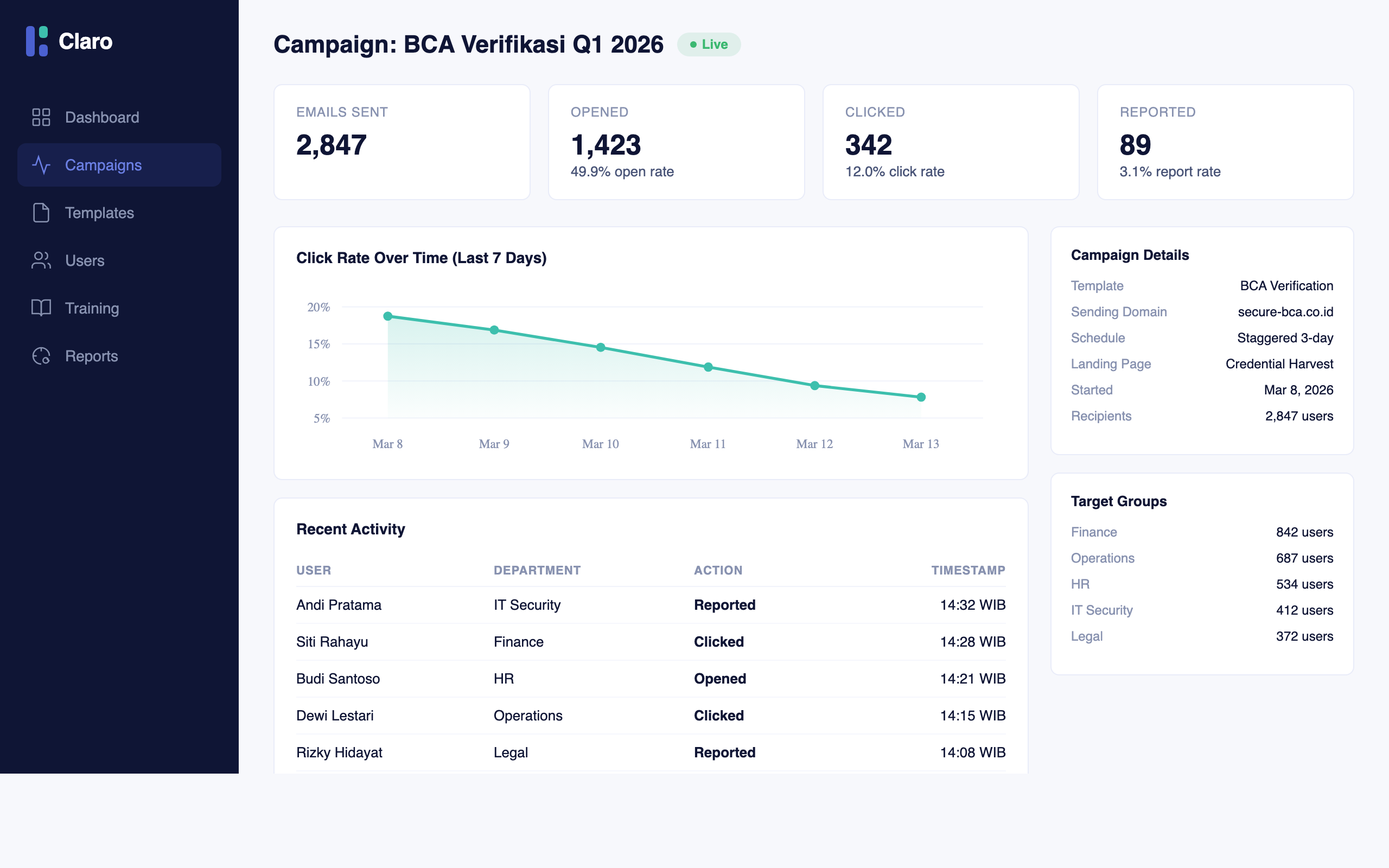Tren tingkat klik, rincian per departemen, dan ringkasan eksekutif dalam Bahasa Indonesia dan Inggris setelah setiap kampanye.